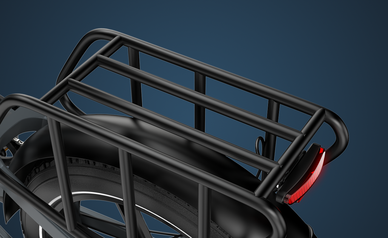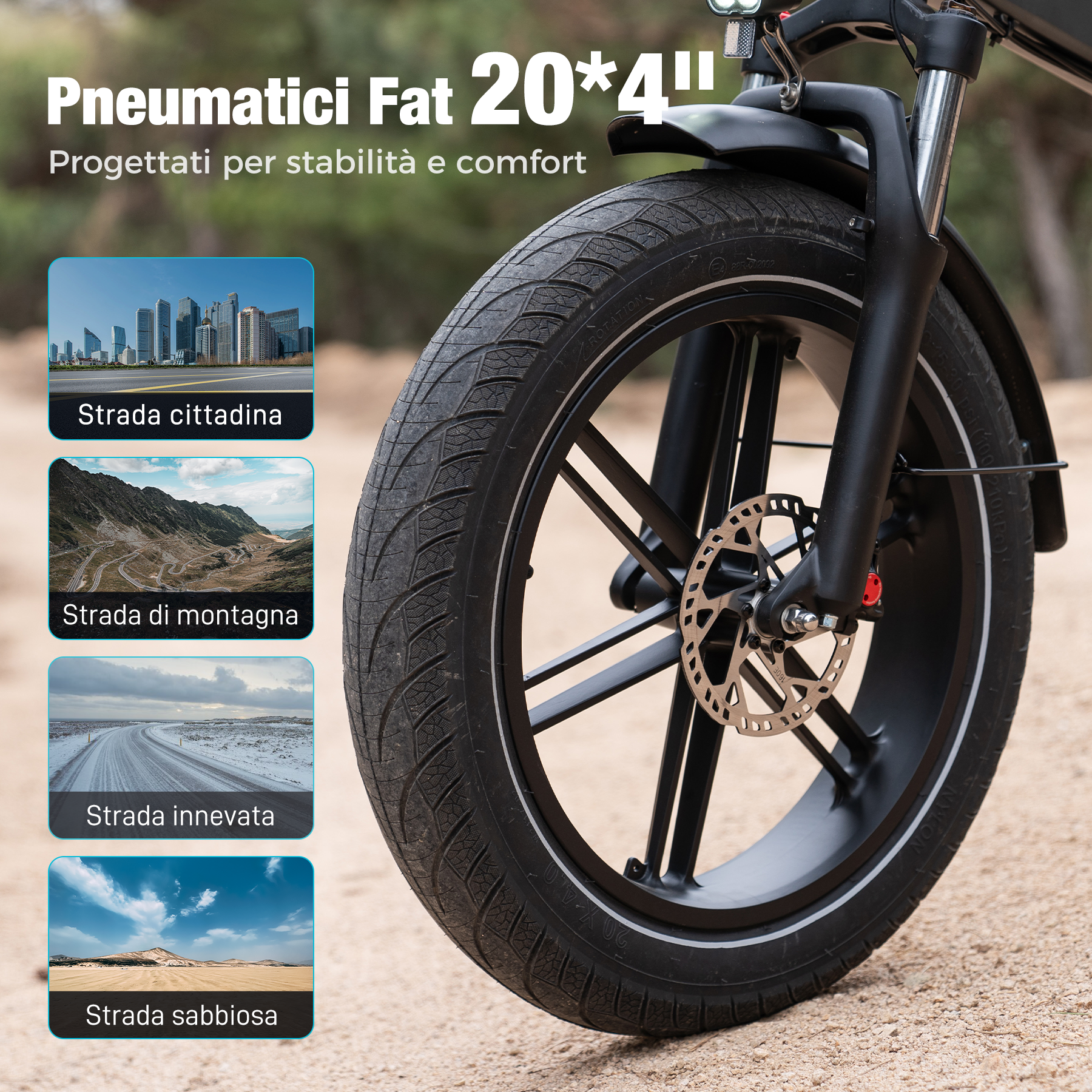 La bici elettrica è dotata di robusti pneumatici da 20×4,0 pollici con tecnologia antiforatura. Progettati per resistere a oggetti taglienti e garantire affidabilità su ogni terreno, migliorano il comfort e la tranquillità di guida.