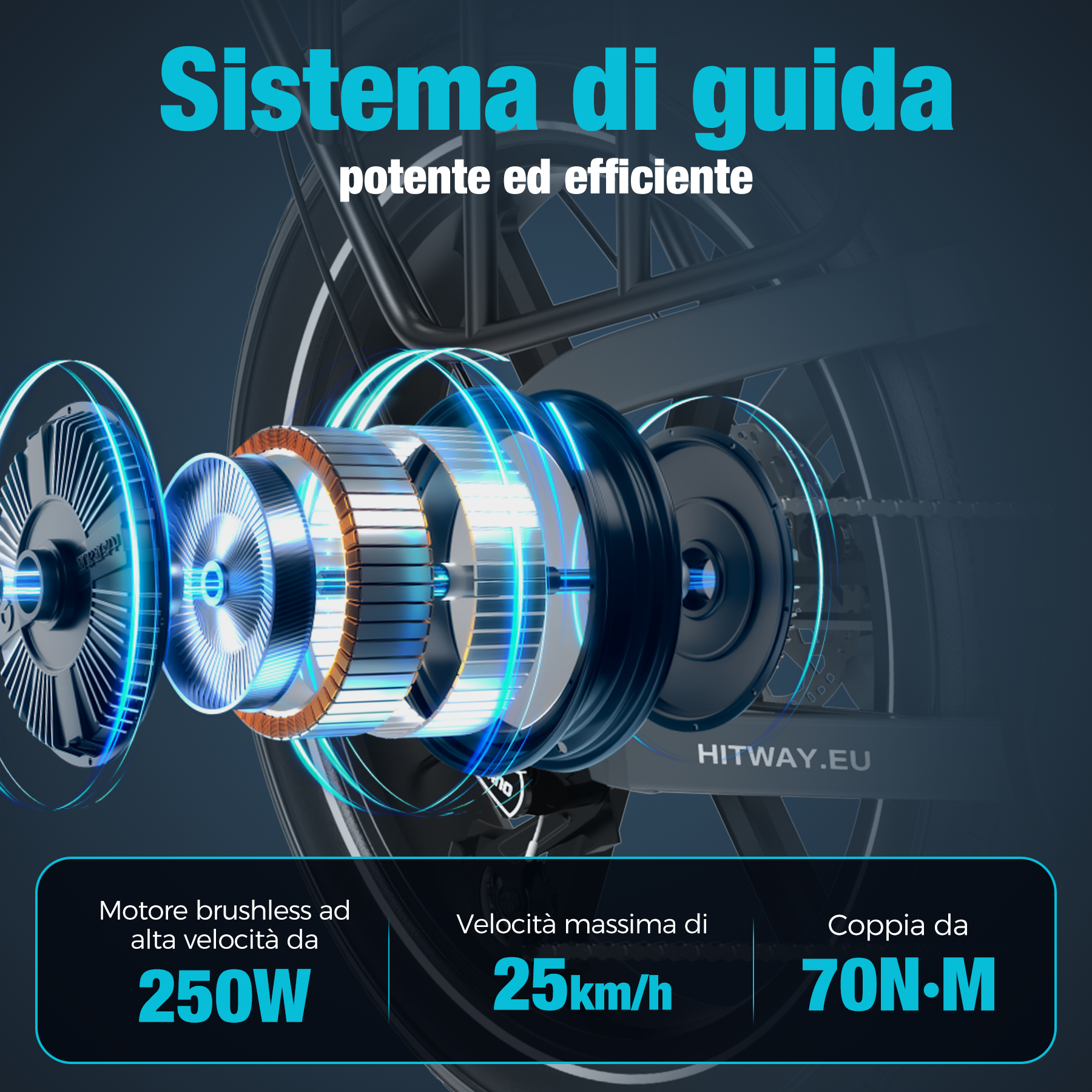 Affronta le salite con facilità grazie al motore da 250W con coppia di 70 Nm per accelerazioni fluide e potenti.