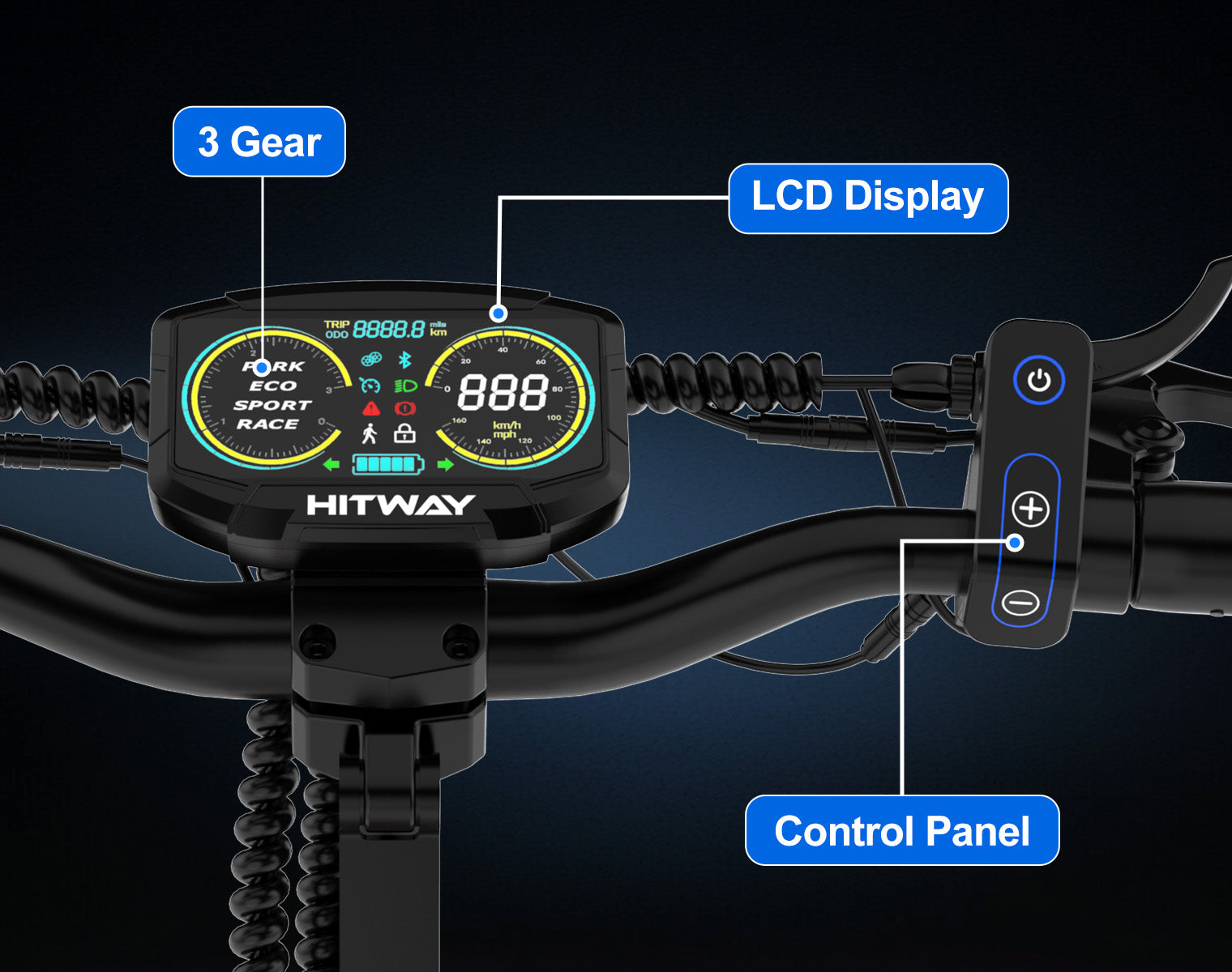 Con un ampio display LCD multifunzione, il tuo monopattino elettrico HITWAY H10 mostra in tempo reale velocità, livello della batteria, chilometraggio e altro ancora. Grazie ai comandi intuitivi sul lato destro del manubrio, puoi cambiare velocità o accendere le luci con un semplice tocco. Tutto sotto controllo, ogni volta che sali in sella.